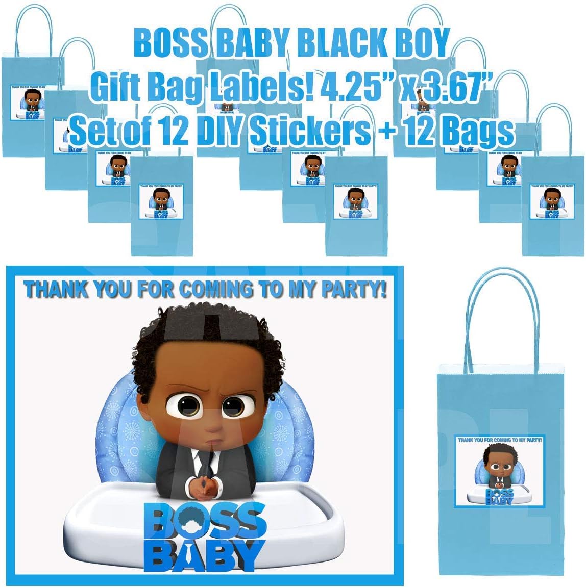 Amazon Com Party Over Here Black Boss Baby Stickers Light Blue Gift Bags Label Dimensions 3 75 X 4 75 12 Pcs